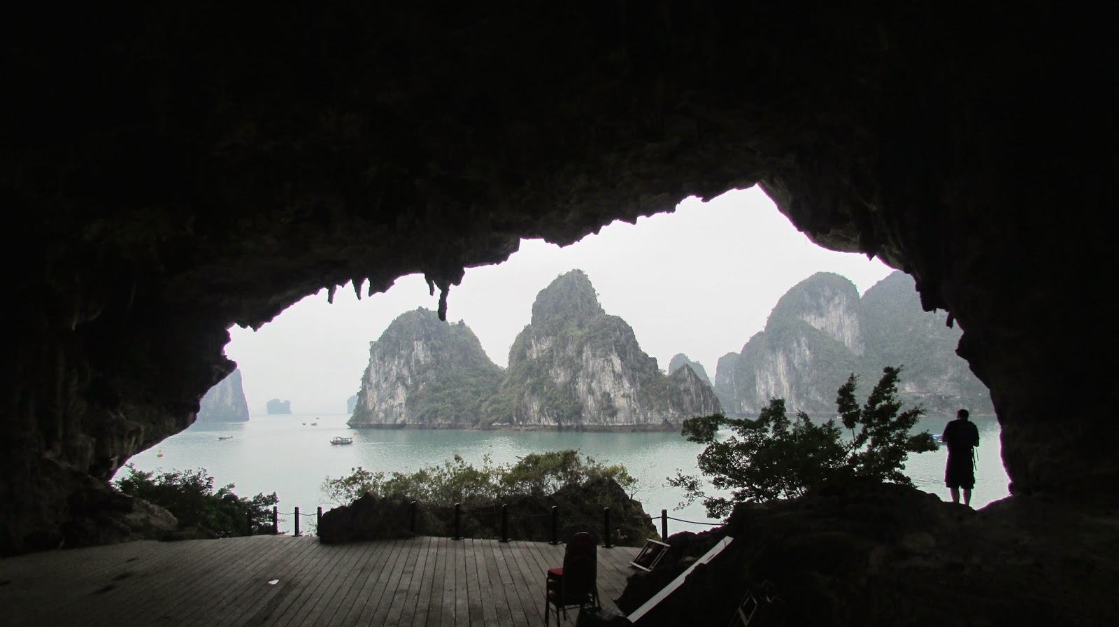 A relatively uneventful evening apart from the fun company of Alistair at dinner; the following day, I awoke later than expected, with the gentle floating on the water, and the day began after breakfast with my new friend, Dale. Almost everyone had left as most stayed aboard only one night, so with Dale and a couple, we were handed plastic to wear to keep the rain away, in various colours to choose from and off we went on another boat to visit a cave on an island.